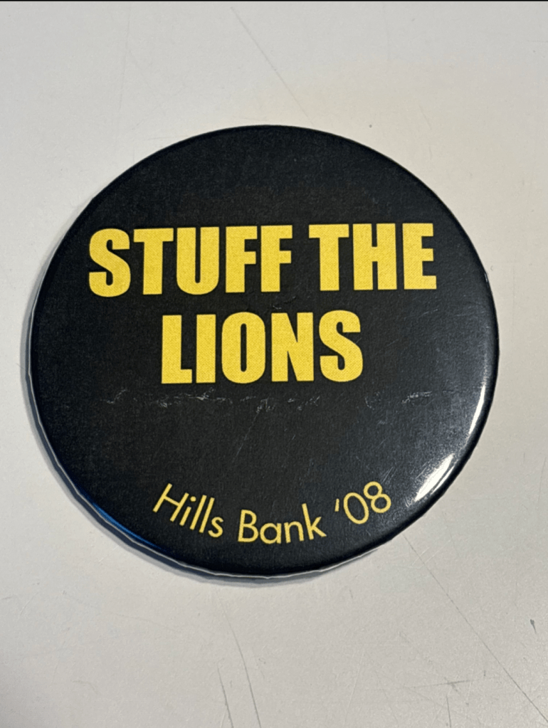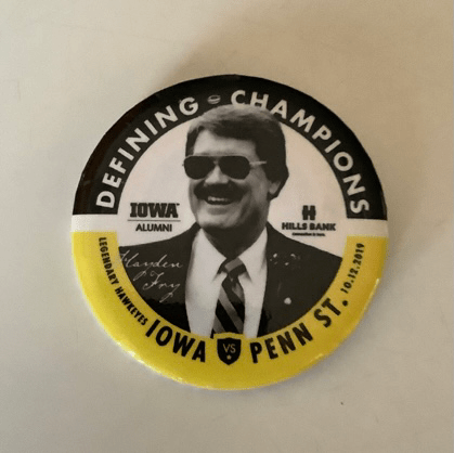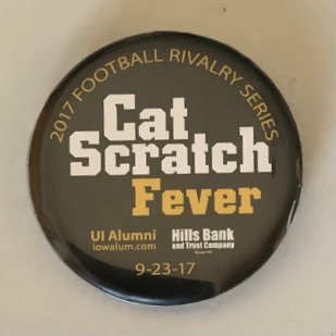 Hills Bank made slogan buttons from at least 2008 to 2019. In 2015 they made buttons for home and away games, but in general they only made home and bowl games. They did not make buttons in 2012, according to a collector. The buttons were black, except in 2011 when they were yellow. In 2018 the buttons featured throwback logos and in 2019 they featured famous Iowa alumni.