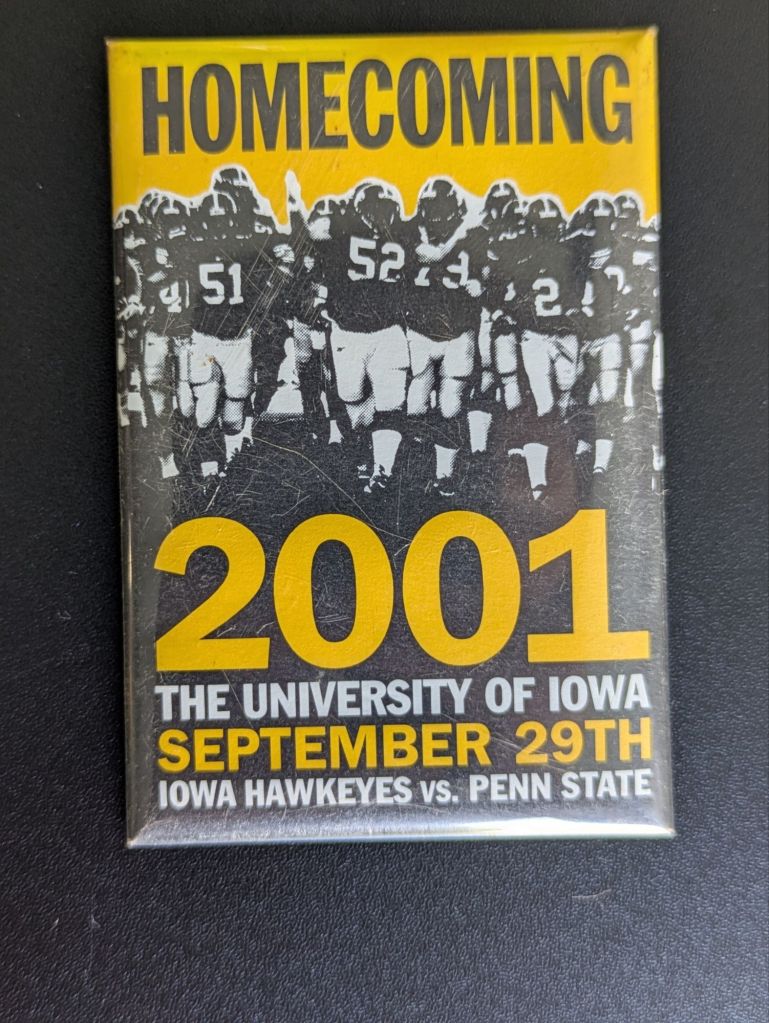 Iowa has also made Homecoming buttons since the mid-1920s. Penn State traveled to Iowa for their homecoming on four occasions, all of which have buttons: 1930, 2001, and 2010. The University catalogs these buttons here.