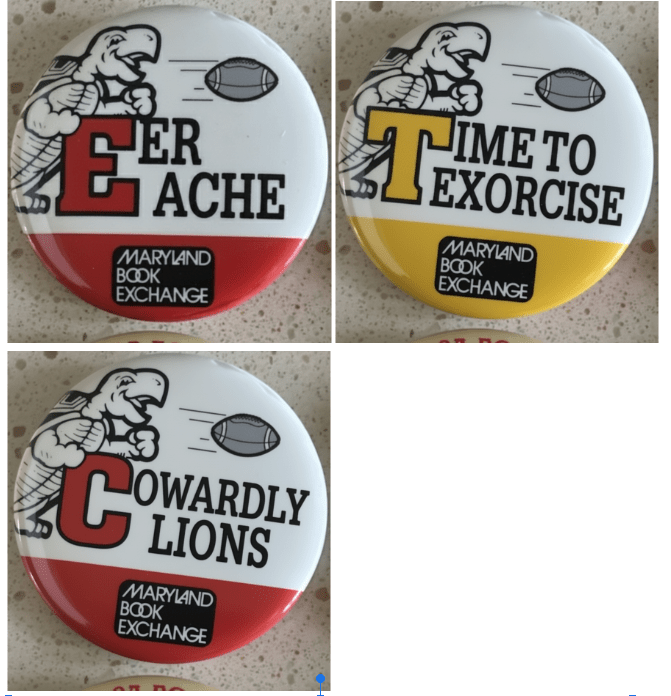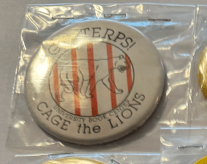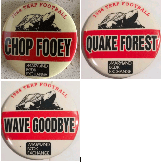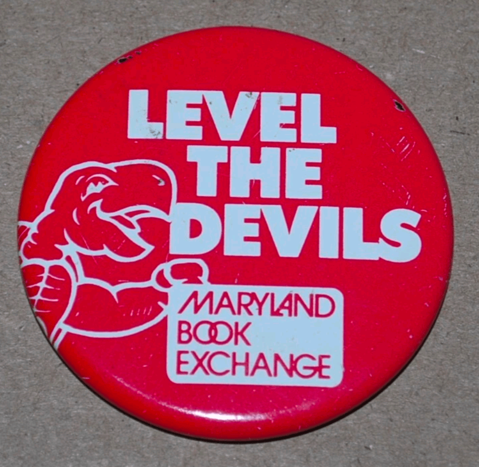 The Eateries kept making basketball buttons into the mid 1990s, suggesting this Maryland Book Exchange button is for the football team. The slogan is likely Duke, “Level The Devils,” who Maryland football played at home in 1995. More buttons are needed to be sure.