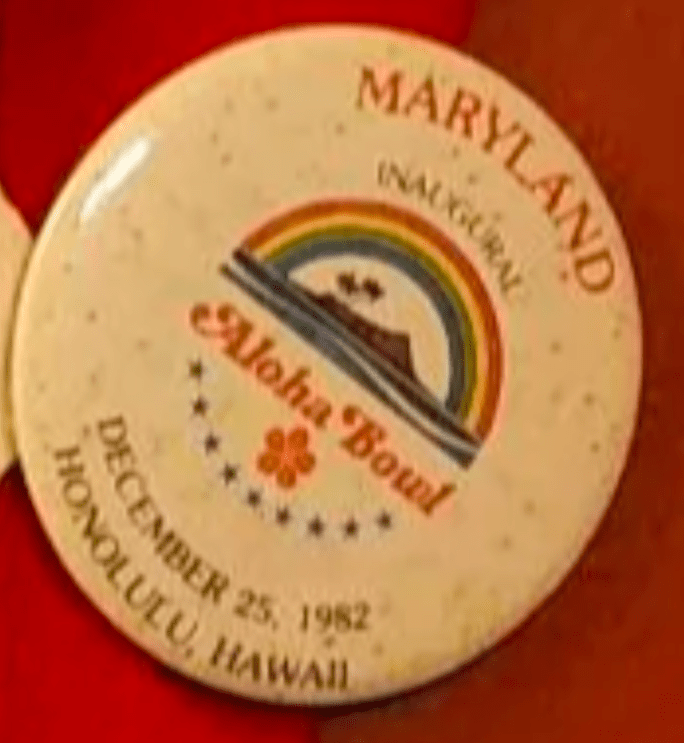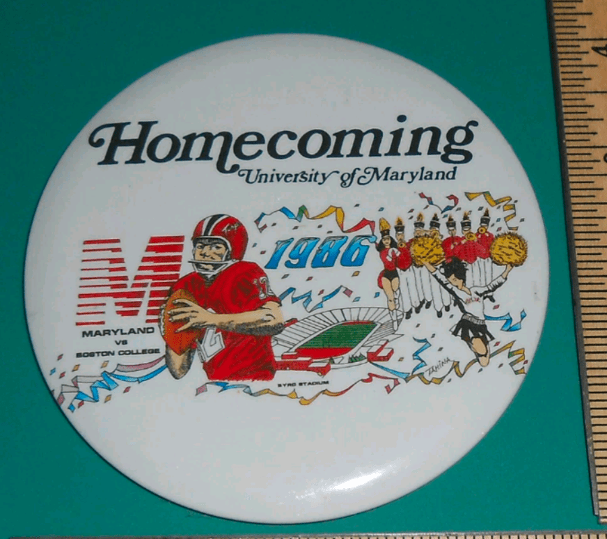 It is also not clear if game-by-game buttons were made in 1986. There was a single season button made with the slogan “Feel It! Maryland Momentum” and the below Homecoming button.