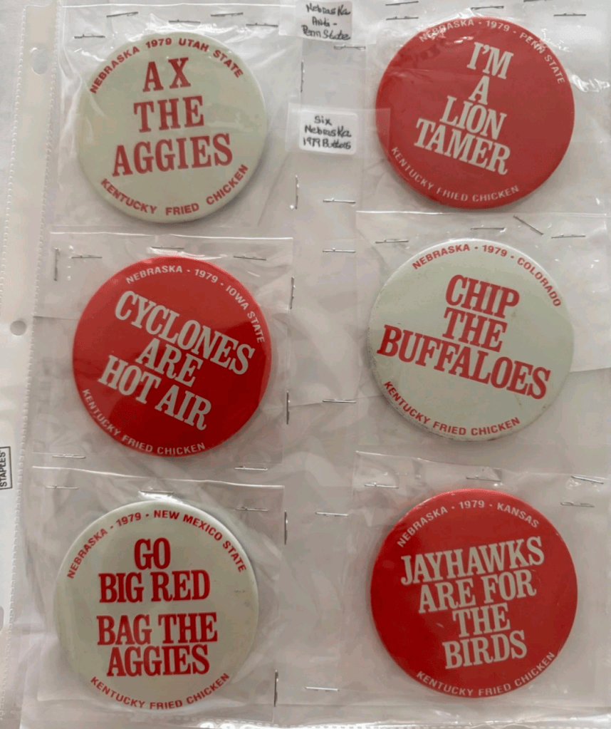 A franchise owner of Kentucky Fried Chicken in Nebraska did two years of slogan buttons for Nebraska home games in 1979 and 1980. The owner found himself in an extra crispy situation when his Iowa-based locations gave out anti-Iowa State buttons, resulting in a local boycott.